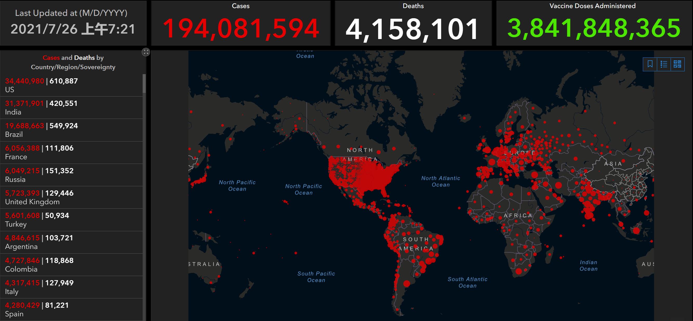 据约翰·霍普金斯大学的疫情追踪数据,截至北京时间7月26日上午8点,全球累计确诊新冠肺炎病例194081594例,累计死亡4158101例,接种疫苗超38.4亿剂次。
