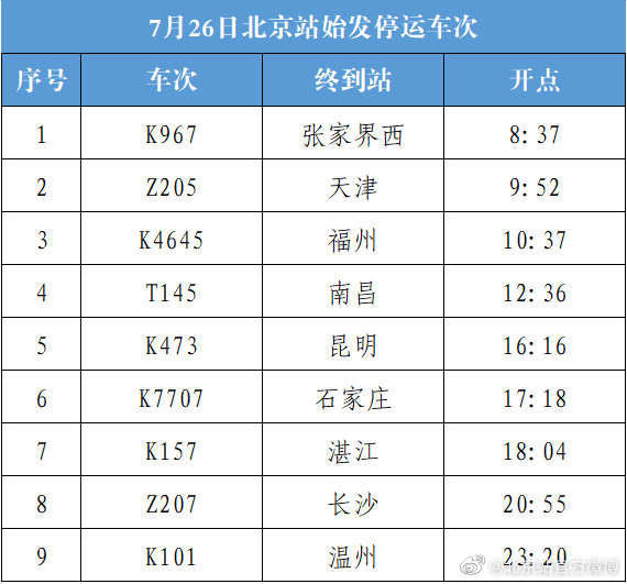 据@北京站官方微博 消息,受不良天气影响,7月26日北京站9趟始发列车停运。已购买停运列车车票的旅客可于30日内办理全额退票手续。