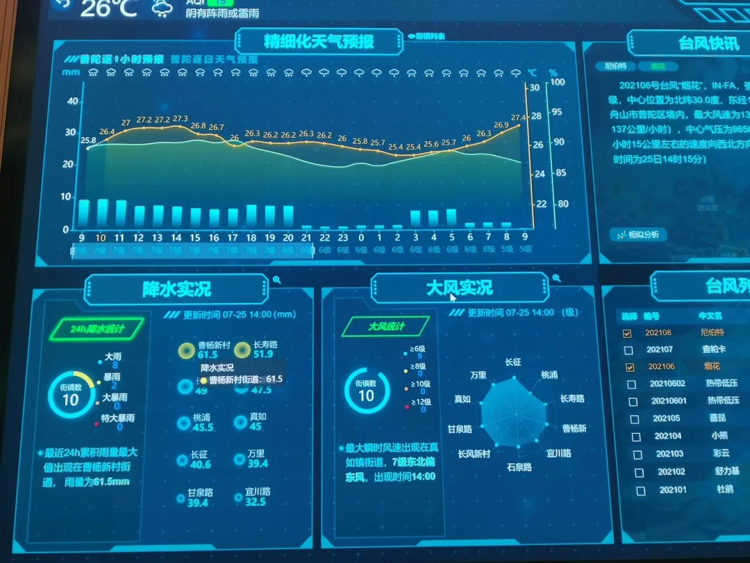 台风期间,普陀区城运中心成为全区突发情况的信息汇集地,工作人员将这些信息快速发送给相关职能部门,联动多部门进行精准高效的处置,确保了台风天气下的城市安全运行。其中新近上线的智慧气象和智慧防汛模块,为迎击“烟花”中提供了重要的数据信息和有力的决策支撑。