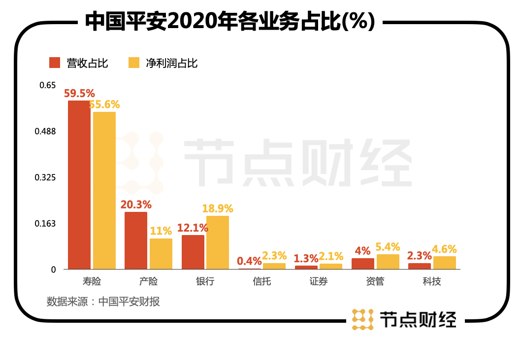 无疑,这才是真正让资本市场担忧的。虽然平安的盘子很大,内容趋向综合多元,但可以明确的是,以寿险为主的保费收入仍是公司的主要收入来源,2020年营收占比在6成以上,也是其开展投资、创新金融工具的“底”。