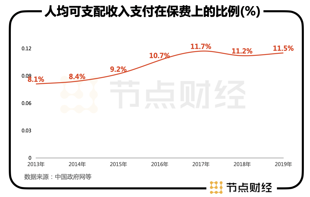 从宏观层面来看,经过数十年的普及教育,截至2019年底,我国人均可支配收入支付在保费上的比例已提高到11.5%,深度和密度分别为4.4%和3051元/人,虽然比之发达国家仍有很长的成长空间,但已经非常接近2014年“保十条”提出的5%和3500元/人的目标,也非常接近2018年全球5.4%的保险深度。