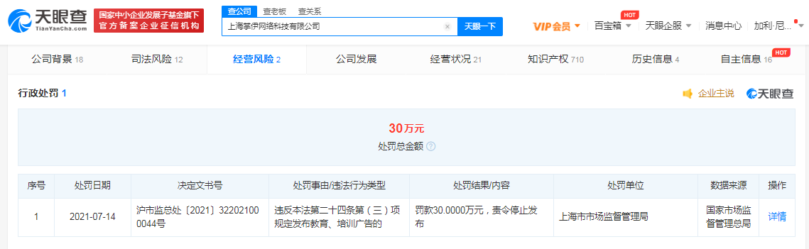 据天眼查APP显示,近日,掌门1对1关联公司上海掌伊网络科技有限公司新增行政处罚,决定文书号为沪市监总处〔2021〕322021000044号,处罚事由为违反本法第二十四条第(三)项规定发布教育、培训广告的,处罚结果为罚款30万元并责令停止发布,处罚单位为上海市市场监督管理局。
