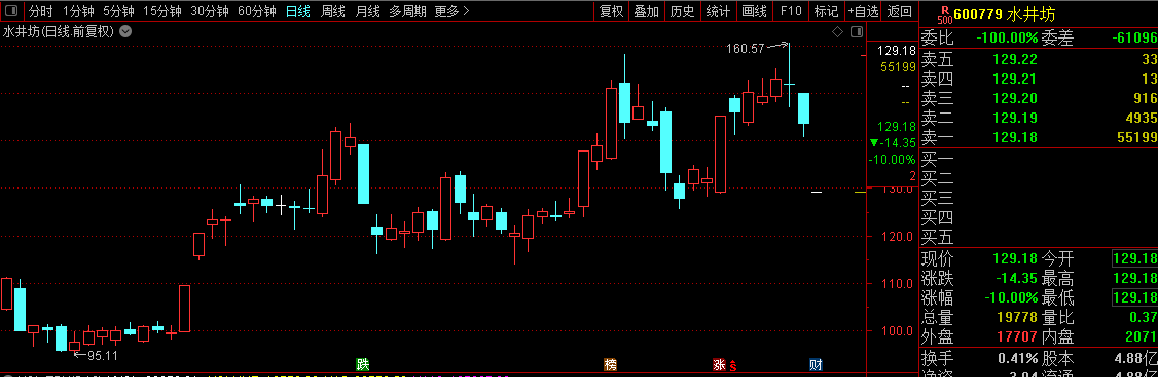 除了贵州茅台之外,五粮液(000858.SZ)的跌幅也超过了8%,前期火热的舍得酒业(600702.SH)、水井坊(600779.SH)更是跌停,海南椰岛(600238.SH)、酒鬼酒(000799.SZ)、山西汾酒(600809.SH)跌幅超过9%,距离跌停板也是一步之遥。