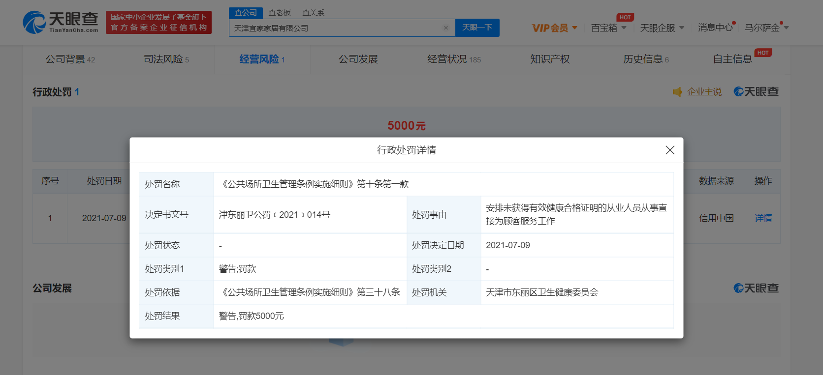 据天眼查APP显示,近日,天津宜家家居有限公司新增一条行政处罚,违法行为类型为《公共场所卫生管理条例实施细则》第十条第一款,违法事实为安排未获得有效健康合格证明的从业人员从事直接为顾客服务工作。处罚结果为警告并罚款5000元,处罚单位为天津市东丽区卫生健康委员会。