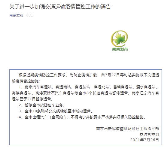 “南京发布”微信公众号7月26日消息,南京市新冠疫情联防联控工作指挥部交通管控组发布通告指出,根据近期疫情防控工作要求,为防止疫情扩散,自7月27日零时起实施以下交通运输疫情管控措施: