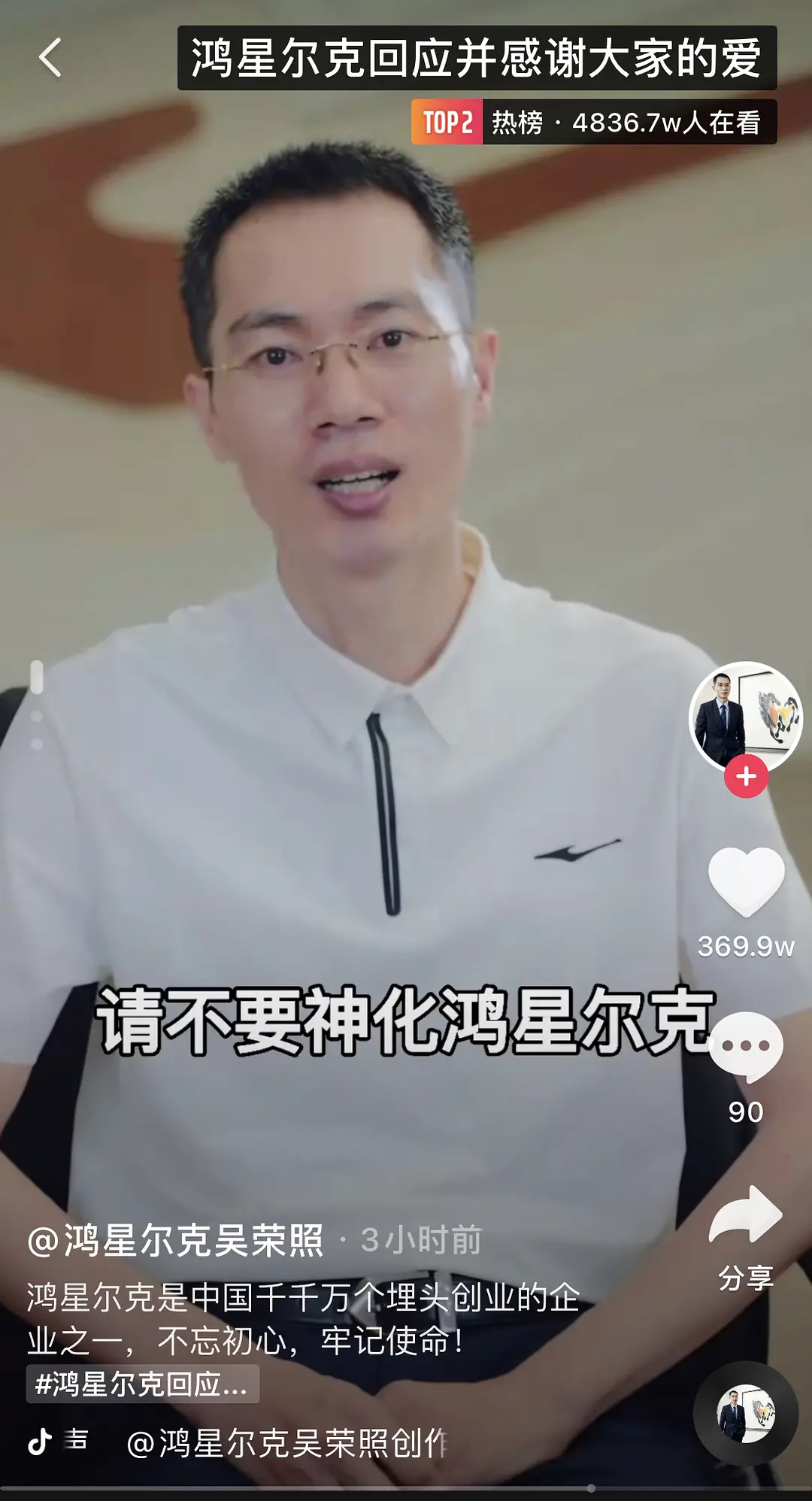 随着事件的不断发酵,鸿星尔克的一系列后续反应,比如劝导消费者“理性消费”,被回应称“就要野性消费”,在直播间播放同样的国货品牌蜜雪冰城的主题曲《你爱我我爱你》,甚至其创始人和集团总裁吴荣照亲自现身直播间回答网友提问,都在持续输出新闻爆点。