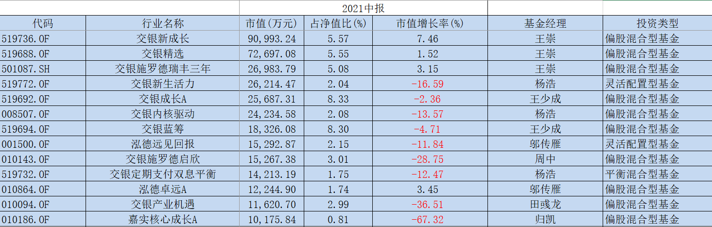 截至二季度末,持有教育行业股票市值超过1亿元的基金共计13只,交银施罗德有10只。其中,王崇管理的三只基金(交银新成长、交银精选、交银瑞丰三年)、杨浩管理的三只基金(交银新生活力、交银内核驱动、定期支付双息平衡)、王少成管理的两只基金(交银成长、交银蓝筹)、田彧龙管理的交银产业机遇、周中管理的交银施罗德启欣均上榜。