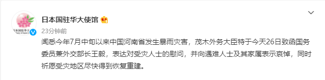 @日本驻华大使馆 微博7月26日发布消息称,闻悉今年7月中旬以来中国河南省发生暴雨灾害,茂木外务大臣特于今天26日致函国务委员兼外交部长王毅,表达对受灾人士的慰问,并向遇难人士及其家属表示哀悼,同时祈愿受灾地区尽快得到恢复重建。