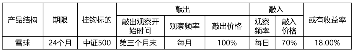 以一份挂钩中证500的24个月雪球产品为例,券商每日观察标的收盘价,一旦收盘价低于70%,则视为敲入,投资者需要开始考虑可能出现亏损;从第三个月末开始,每个月固定的某一天,也会同步观察是否达到100%,一旦达到,则视为敲出,产品立即终止。