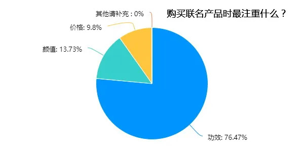 95后在选择联名产品时最注重哪一点?采访数据显示,76.47%的消费者认为是功效,只有13.73%和9.8%的消费者分别认为最重要的是颜值和价格。