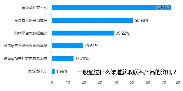 从95后获取联名产品资讯的渠道来看,占比达一半以上的两类渠道分别是:74.51%的美妆类种草平台,50.98%的身边有人购买和推荐。“购物平台大数据推送”“联名IP官方账号发布的消息”“联名IP相关社群内共享消息“分别占39.22%、19.61%、13.73%。