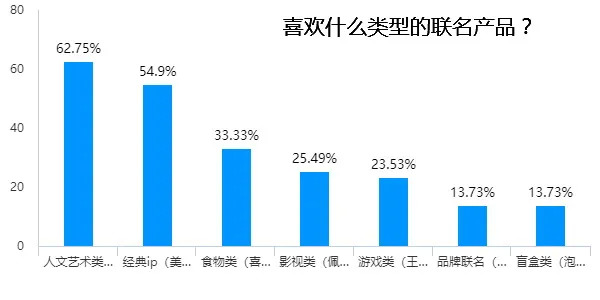 95后最喜欢的联名IP类型扎堆在人文艺术类(如博物馆、故宫、颐和园、穆夏等)和经典IP(如美少女战士、猫和老鼠、樱桃小丸子、Hellokitty等),分别占比62.75%和54.9%。
