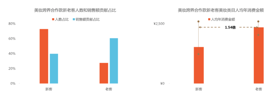 据2019年3月9日第一财经商业数据中心联合天猫发布的《跨界宝典xBrandUnion美妆行业品牌联合跨界研究》,超过70%的美妆跨界合作款消费者是品牌新客,从跨界合作款新老客在美妆类目的人均消费金额来看,老客的消费能力的新客的1.54倍,其购买力明显高于新客。