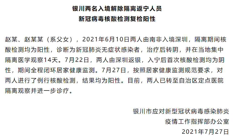 据“银川发布”微信公众号消息,银川两名入境解除隔离返宁人员核酸检测复检阳性。赵某、赵某某(系父女),2021年6月10日两人由南非入境深圳,隔离期间核酸检测均为阳性,诊断为新冠肺炎无症状感染者,治疗后转阴,并在当地集中隔离医学观察14天。7月22日,两人由深圳返银,入宁后首次核酸检测均为阴性,期间全程闭环居家健康监测。7月27日,按照居家健康监测规范要求,对两人进行了例行核酸检测,结果均为阳性。目前,两人已转至自治区定点医院隔离观察并进一步诊疗。
