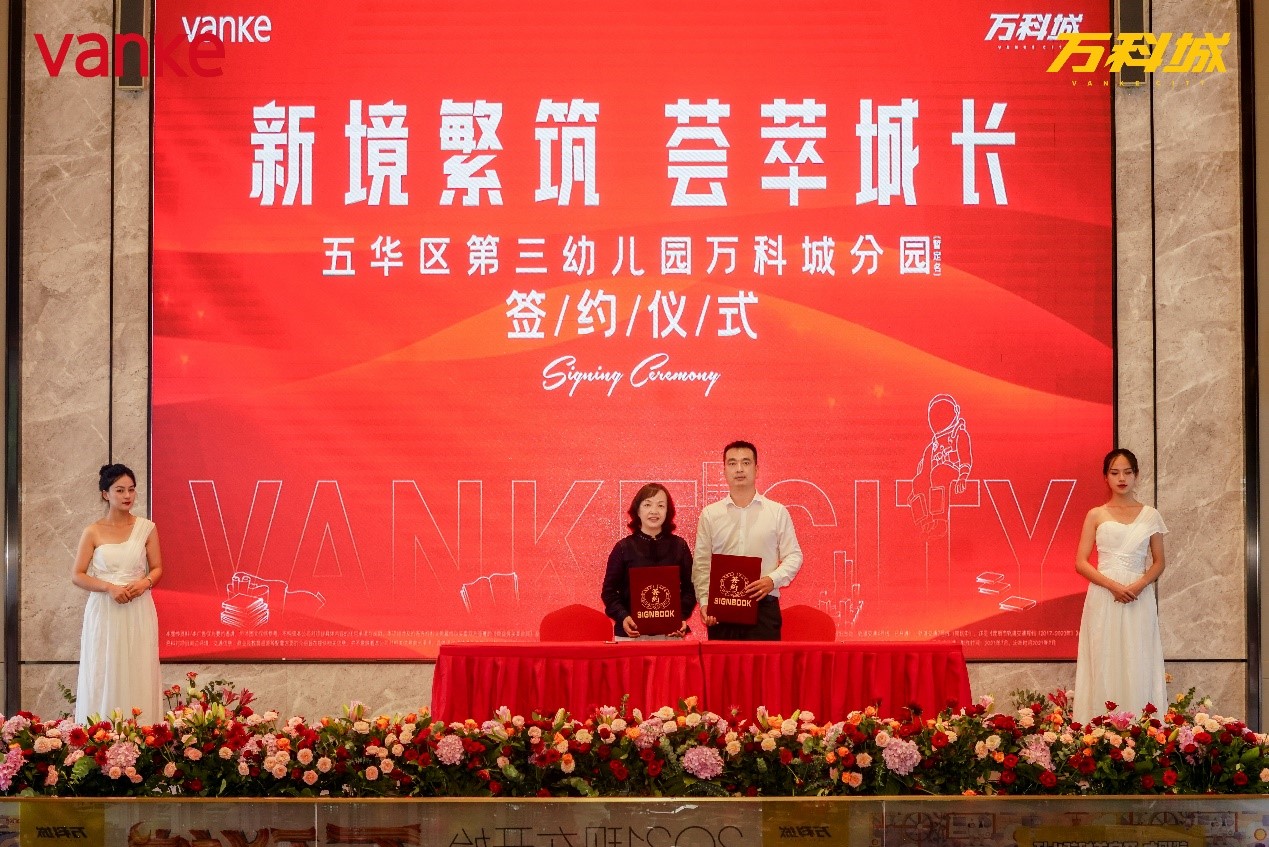 紧接着,昆明市五华区第三幼儿园副园长王东梅女士、云南万科合伙人李春杰先生,登台签约,在各大媒体与各位来宾的见证下,万科城X昆明市五华区第三幼儿园签约仪式圆满完成!