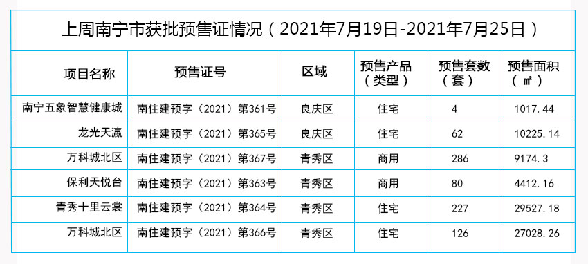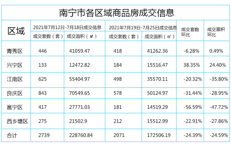 据南宁市住房保障和城乡建设局网站监测数据显示,上周(2021年7月19日-7月25日)南宁市商品房成交2071套,成交面积共计17.25万㎡,较前一周成交套数环比下降24.39%,成交面积环比下降24.59%。