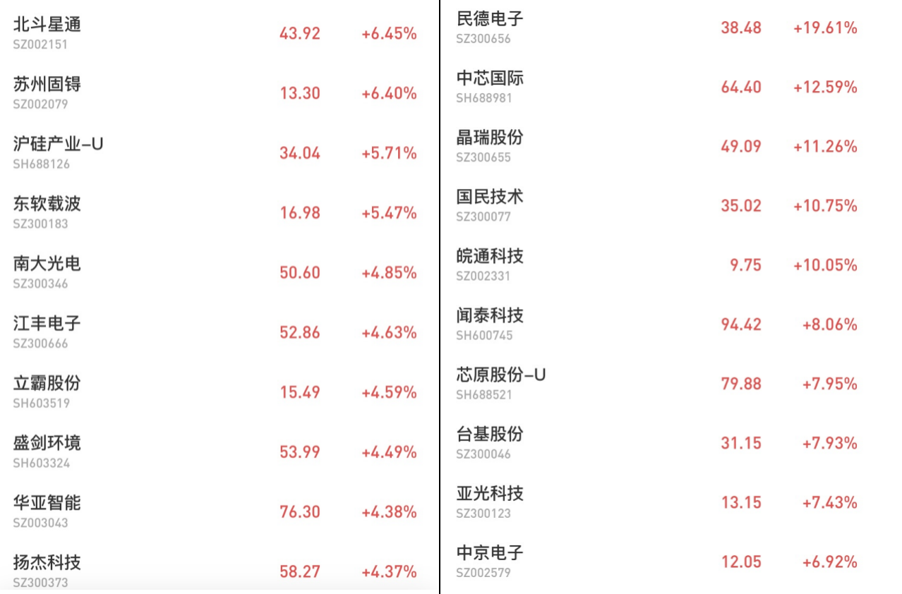 中芯国际拉动下,整个半导体板块今日一片飘红。受大势影响,芯片股集中的科创50指数今日收跌0.75%,但盘中一度大涨4.5%,创年内新高。其中,民德电子涨19.6%报38元;晶瑞股份、国民技术、皖通科技皆涨超10%;闻泰科技、芯原股份、台基股份、亚光科技涨超7%,长川科技等多只芯片股票价格创历史新高。