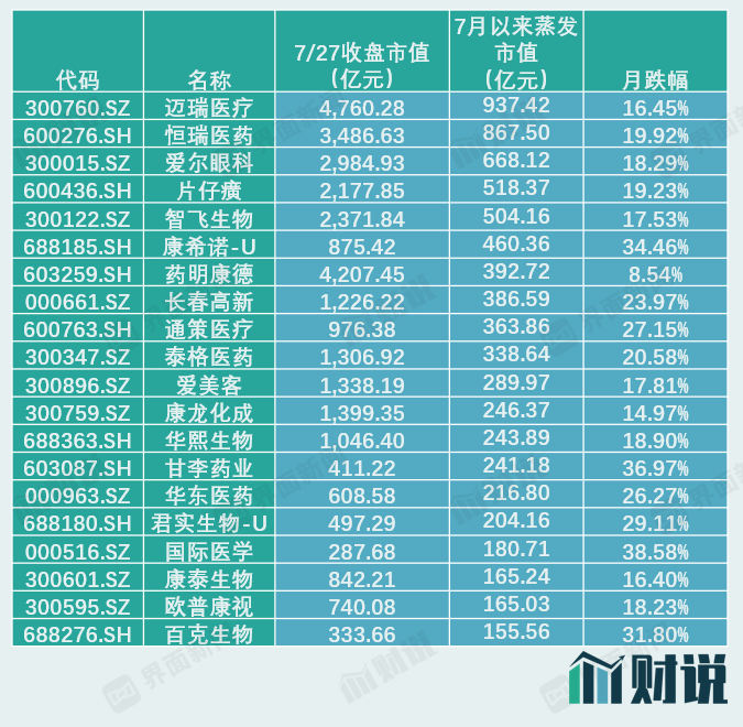 迈瑞医疗(300760.SZ)与恒瑞医药(600276.SH)分别是板块中市值最高和次高的企业,过去1个月内市值累计蒸发分别达937亿元和867亿元,月跌幅达16.45%和19.92%。两家公司又分别是医疗产业最大两个子板块——医疗器械与创新药板块龙头的估值“锚”,引发了连锁反应。