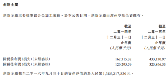 根据彼时公告,2014年-2015年,创新金属实现的税后净利润(未经审核)分别为1.2亿元、3.24亿元。截至2016年9月30日,创新金属的净资产为13.85亿元。