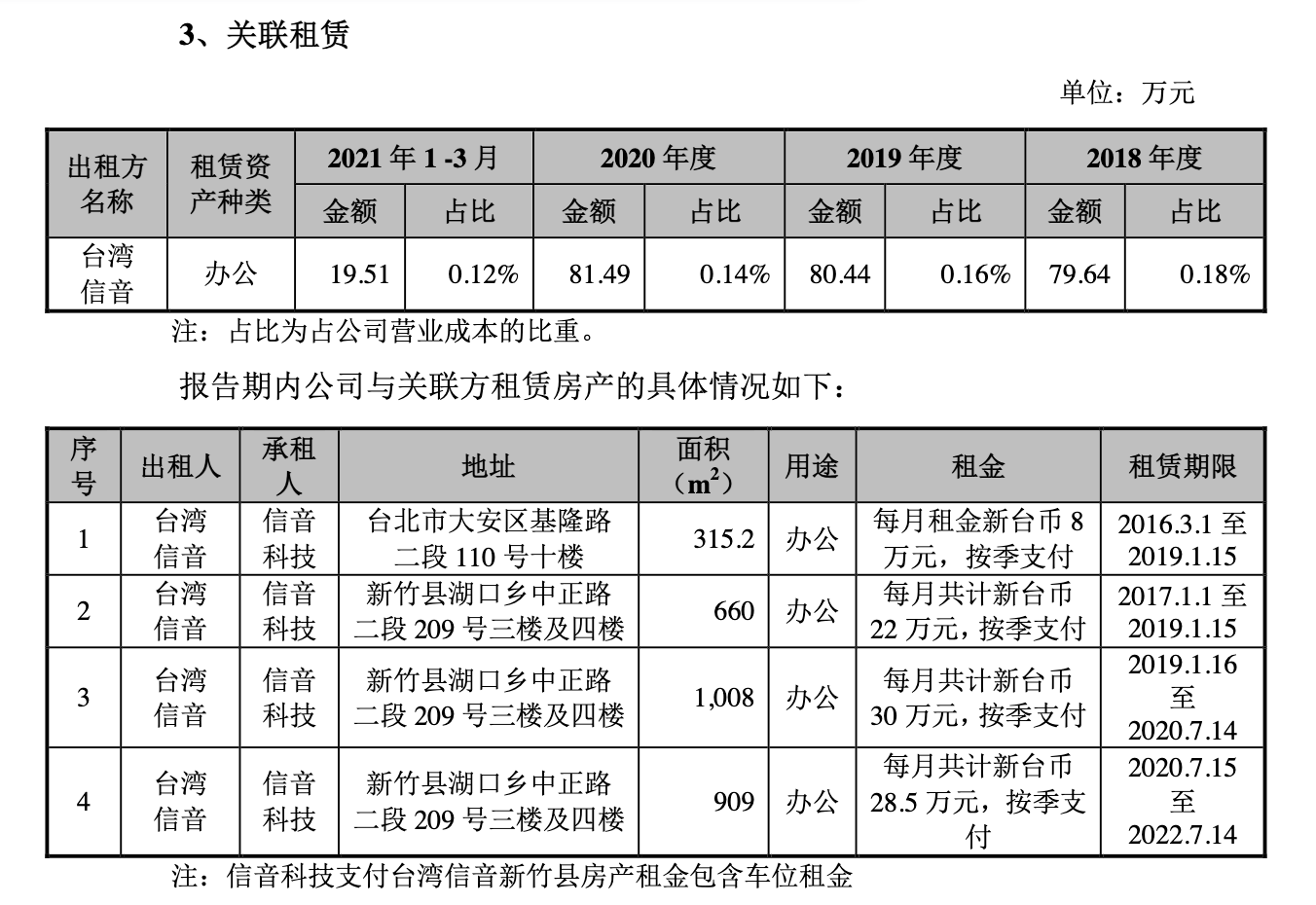 2018年至2021年1-3月,与台湾信音发生关联租赁的金额分别为79.64万元、80.44万元、81.49万元、19.51万元。