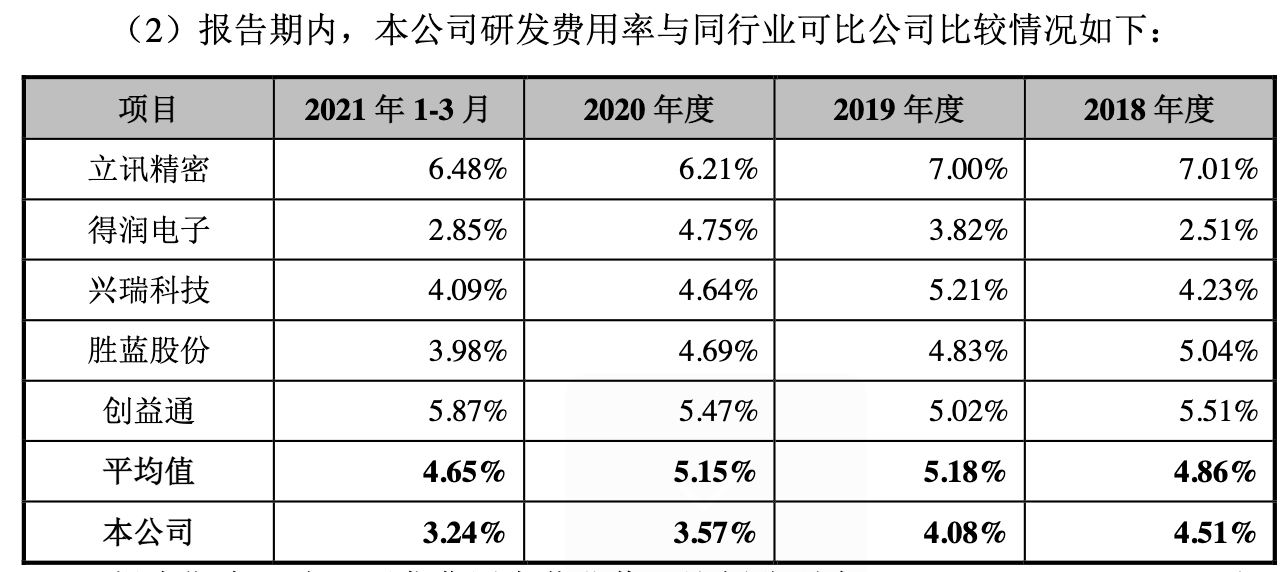 GPLP犀牛财经注意到,信音电子的研发费用率低于行业均值。2018年至2021年一季度,研发费用率分别为4.51%、4.08%、3.57%、3.24%,行业均值分别为4.86%、5.18%、5.15%、4.65%。