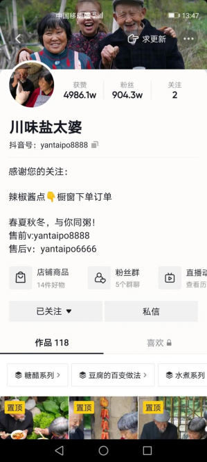 一对上了年纪的银发夫妻,他们朴素慈祥,在直播间一口质朴、诙谐的川话,加上亲切、自然的互动,宛若邻家爷爷奶奶一般没有距离感,聚集了大量的人气,成为了有900W粉丝的“银发网红”。
