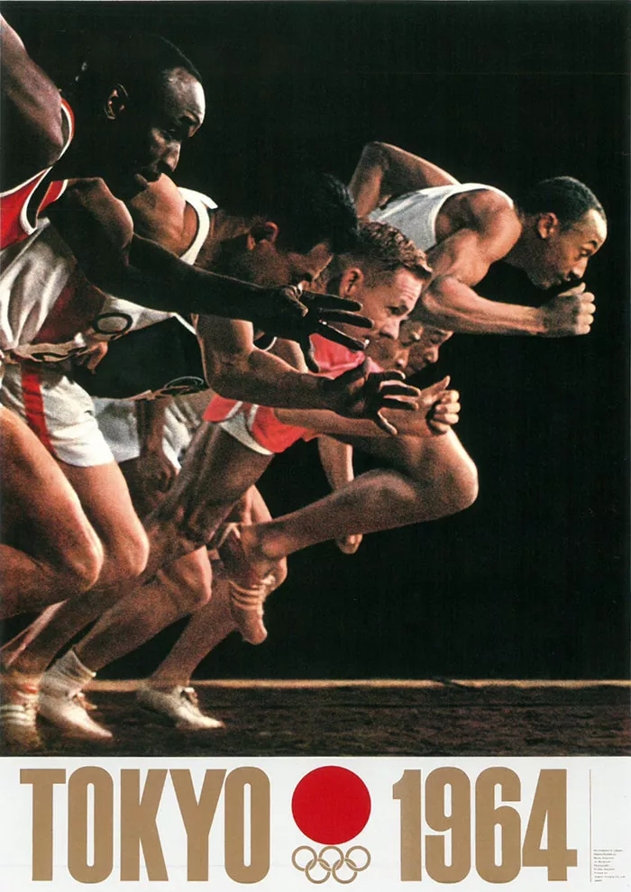 1964年东京奥运会的设计还首次使用照片制作海报,定格了运动过程的瞬间,为静止的画面赋予了动感。