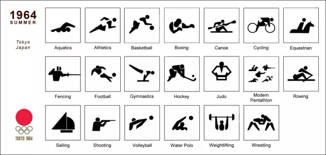 1964年的东京奥运会更是将图标设计提升到了一个新水平,创建了一个完整的印刷、色彩、符号系统,这些风格化、简洁明了的图标突破了语言的障碍,能将信息准确地传达给有着不同文化背景的参赛者。