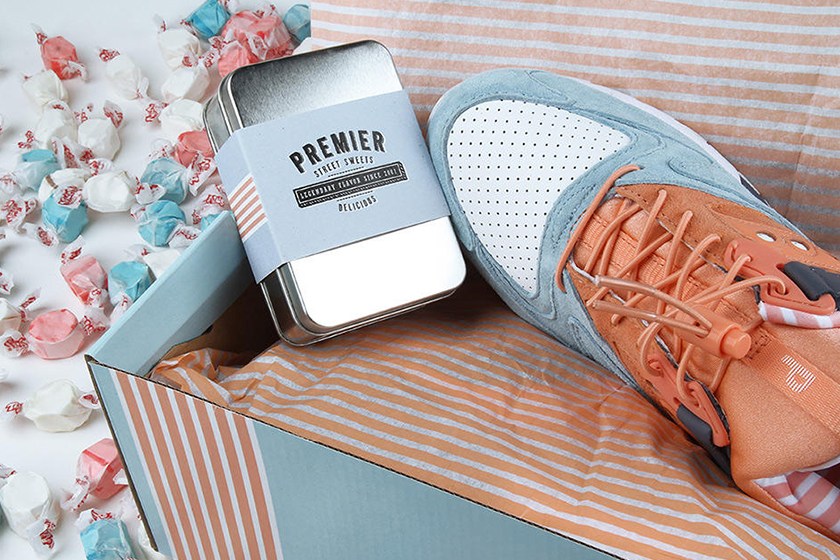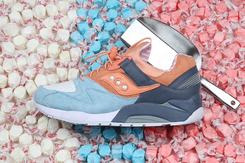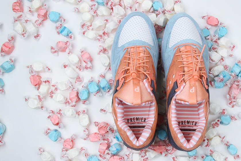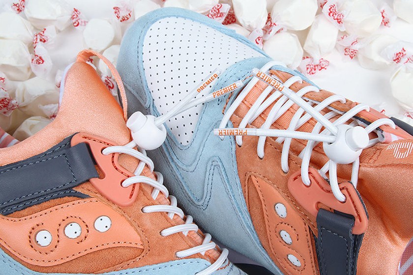 美国密歇根州的知名鞋店Premier和慢跑鞋品牌Saucony推出合作款,起了一个很有少女心的名字,叫“Street Sweets”。新鞋以咸太妃糖为灵感,配以橙色、粉蓝、灰色,售价为140美元。