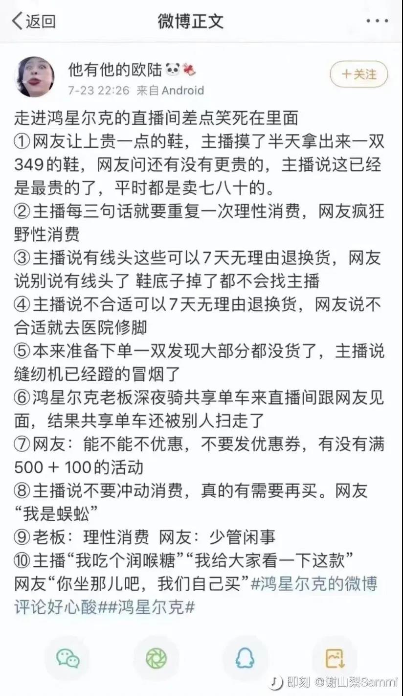 从各方面角度看,鸿星尔克一开始也没有想到能有如此大的传播声量,它只是例行捐款,却意外被微博网友发掘、出圈,此后又在直播间和微博里衍生出诸多“梗”,在各大平台上爆炸性传播,最终“稀里糊涂”地成为一个殿堂级的社会化营销案例。