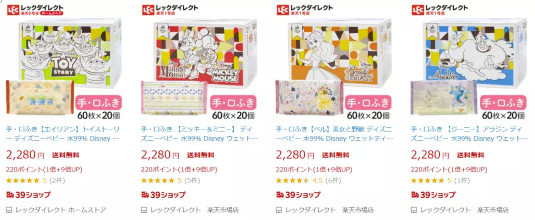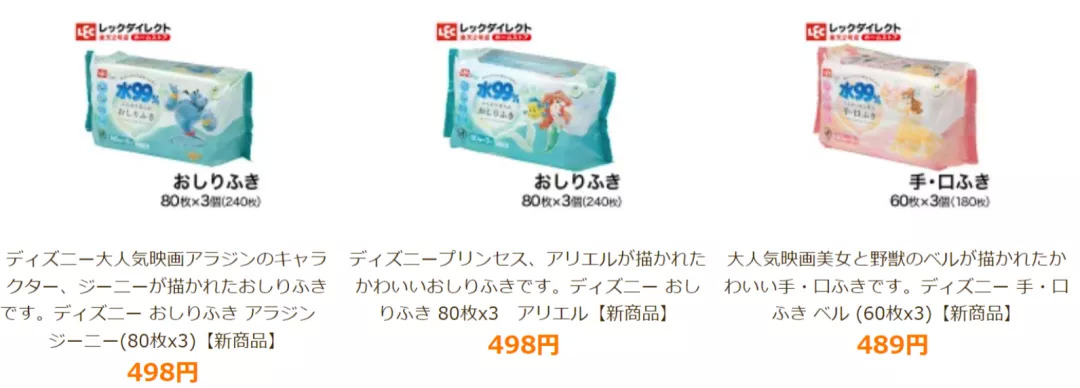 迪士尼授权了多个知名IP,米老鼠、美女与野兽、小美人鱼、阿拉丁、三眼仔等经典形象,LEC将这些形象用于湿巾类产品外包装。乐天市场上,使用迪士尼形象的湿巾单盒售价为2280日元,约合人民币134元。
