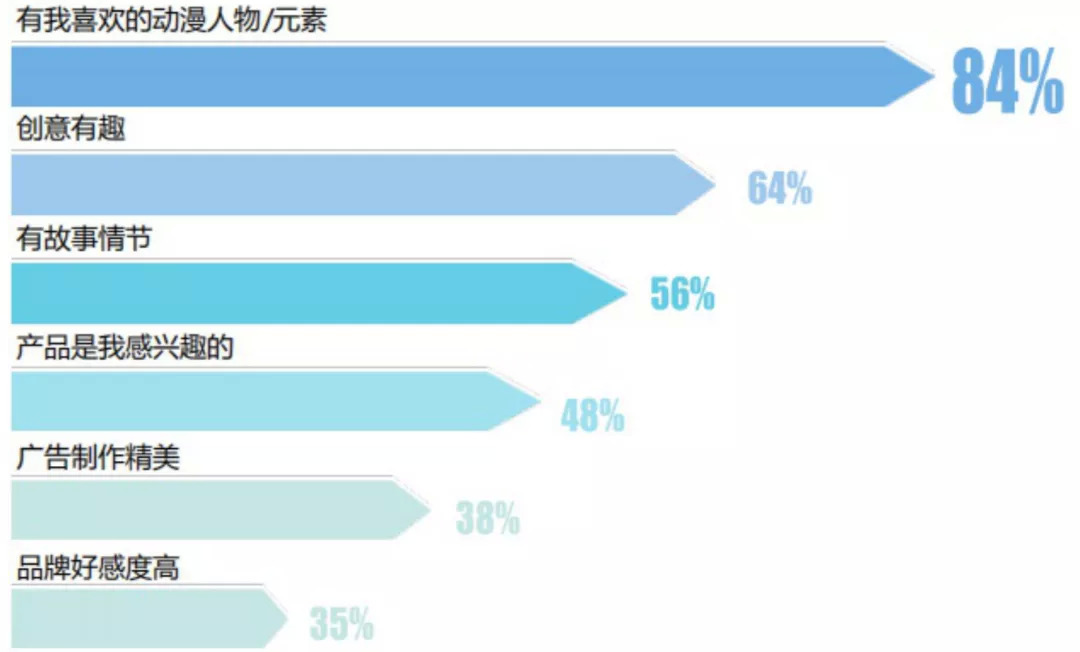动漫IP用户接受程度高、用户干扰度小、灵活度高。用户面对自己喜欢的动漫作品、元素、人物相结合的营销内容,接受度会显著提高。《2020微博动漫白皮书》中的调查数据也证明了这一点。