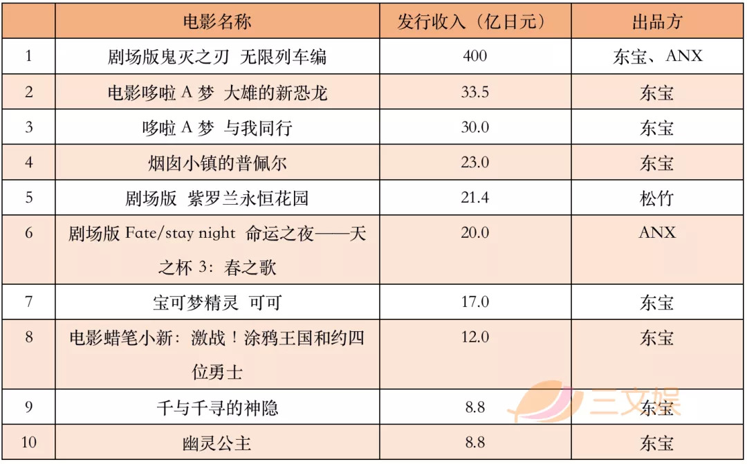 而日本动画近年吹起怀旧风、情怀风,也体现了经典IP的持久吸金能力。2020年动画电影发行收入前10名中除了黑马《鬼灭之刃》和《烟囱小镇的普佩尔》,其他都是经典动漫IP电影。