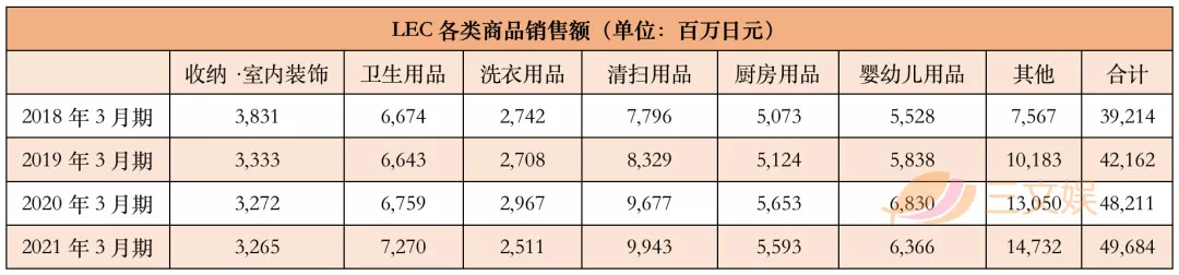 可以看出,LEC目前的各类商品中,除去无法分类的其他类之外,卫生用品、清扫用品、厨房用品、婴幼儿用品一直是赚钱的大头。2021财年LEC的总销售额为496.84亿日元,其中这四项总和为291.72亿日元,占总收入的58.72%。