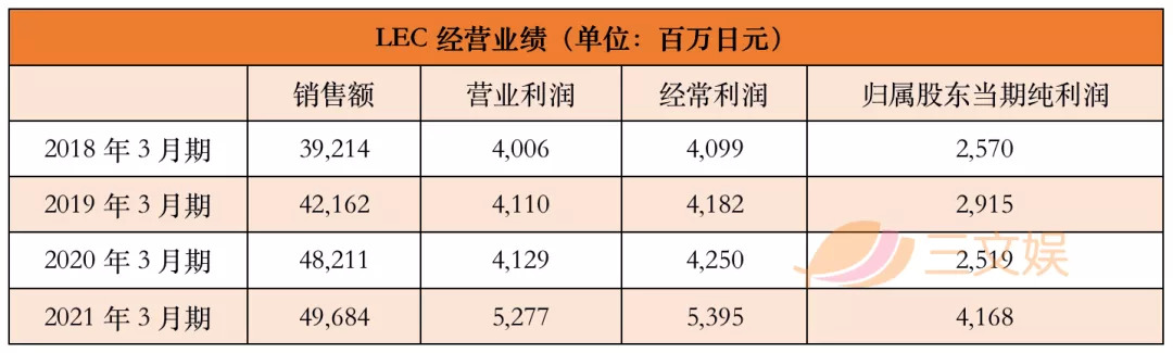 LEC于2019年(2018.4.1-2019.3.31)开始公布该财年的财务数据,在2019年财报中LEC提到,当时日本国内经济情况有着缓慢恢复的态势,但由于日本社会的少子化与老龄化,人手不足使得人件费居高不下,且海外消费市场前景不明,保护主义抬头。