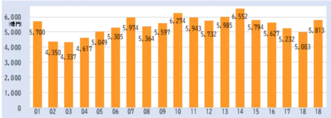 图为日本动画2001-2019年的商品化市场规模,单位为亿日元。可以看到,日本动画商品化市场规模基本稳定在5000亿日元上下,非常可观,且不会有太大浮动。稳定广阔的动画商品化市场为各行业对动漫IP的应用提供了信心,合理运用IP与商品进行结合仍将是提高商品接受度的有效途径之一。