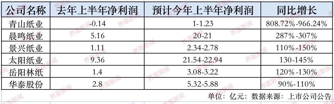 太阳纸业(002078.SZ)、岳阳林纸(600963.SH)、华泰股份(600308.SH)净利同比增长也均在一倍以上,至多分别达145%、130%和110%。