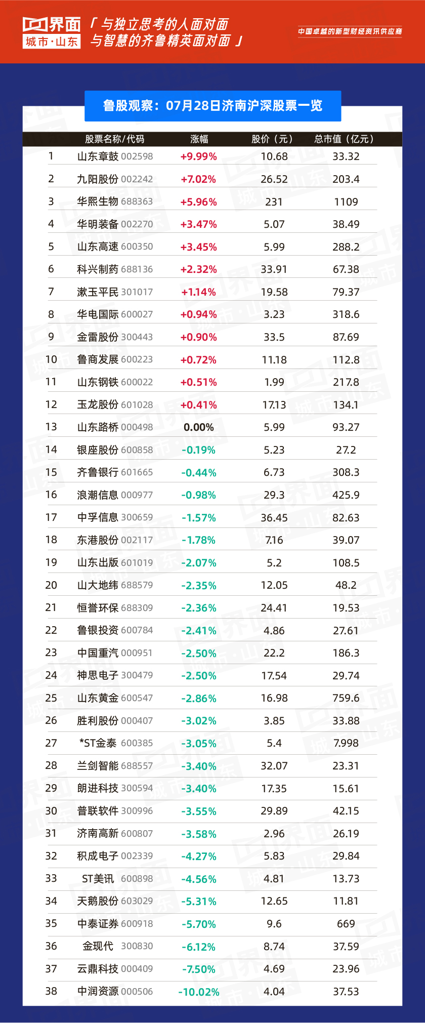 7月28日,山东59股上涨,4股持平,186股下跌。