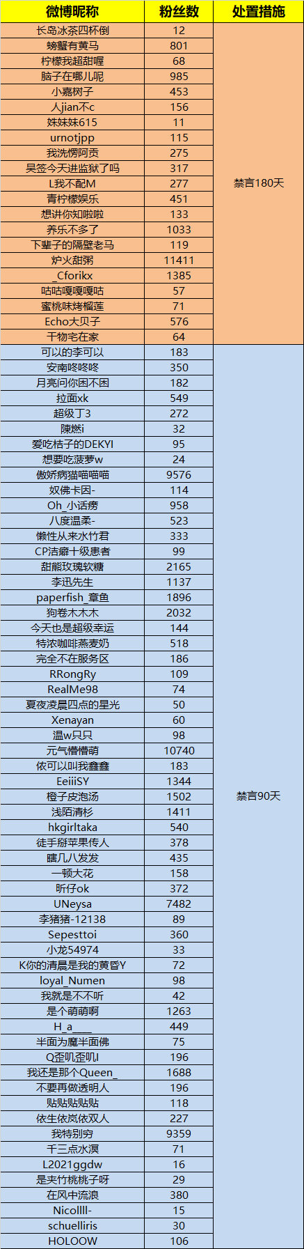 依照《微博社区公约》的相关规定,站方对恶意攻击运动员的80个账号(@长岛冰茶四杯倒 @螃蟹有黄马 @柠檬我超甜喔 等)做出禁言90天至180天的处置。同时,清理攻击微博共计80条,解散相关话题4个。