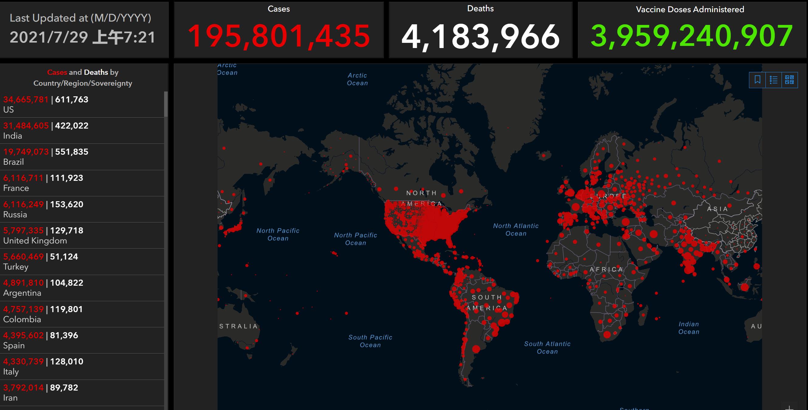 据约翰·霍普金斯大学的疫情追踪数据,截至北京时间7月29日上午8点,全球累计确诊新冠肺炎病例195801435例,累计死亡4183966例,接种疫苗超39.5亿剂次。