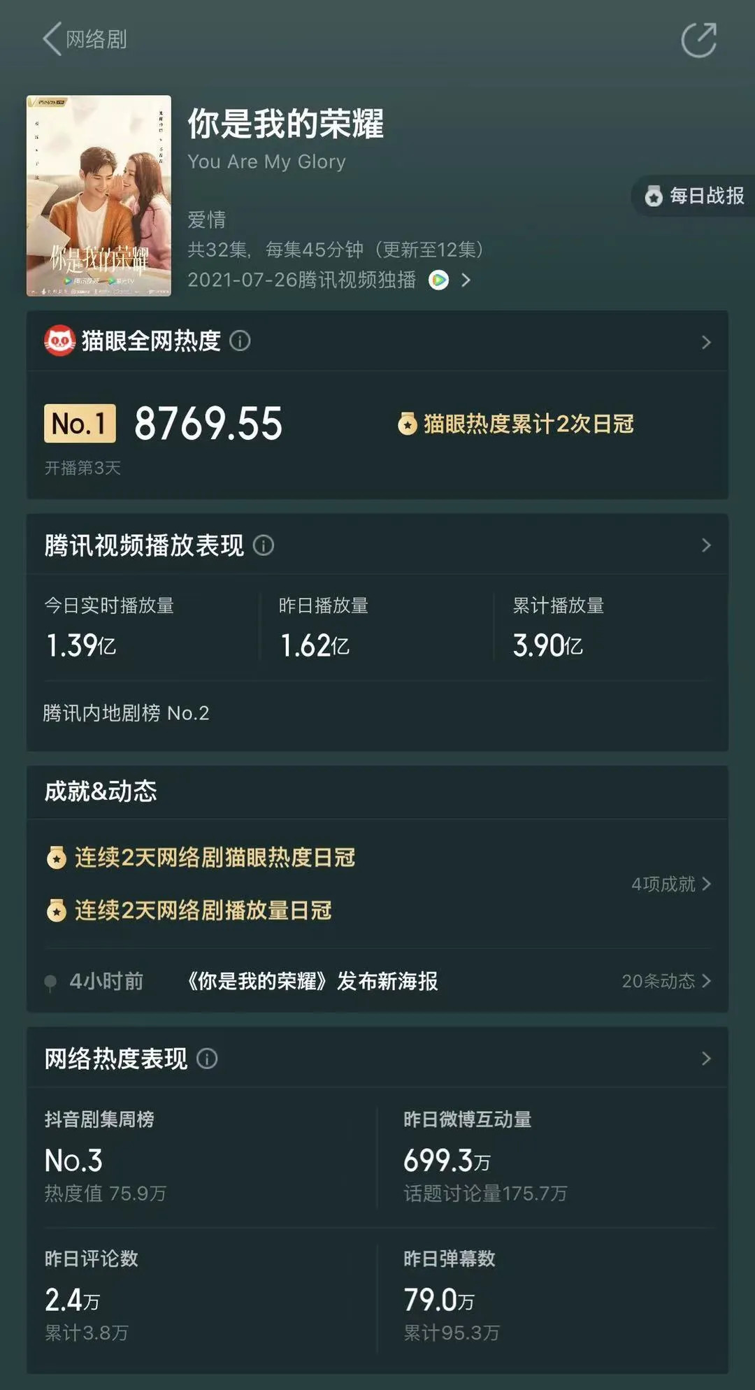 而在正式开播后,该剧迅速攀升至猫眼全网热度榜首,历史最高热度达到9830,同时在腾讯视频站内热搜榜、电视剧榜、畅销榜等多个榜单位列第一。同时在微博平台上,#你是我的荣耀开播##杨洋演的于途##迪丽热巴演的乔晶晶#等相关话题登上微博热搜,截至目前微博主话题阅读量已达18亿+。