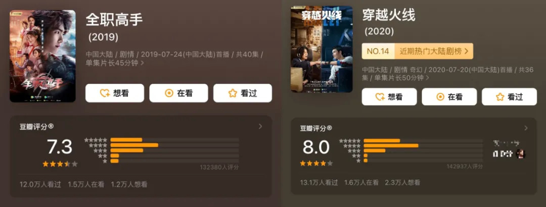 至此,电竞题材影视作品也衍生出了两种大相径庭的开发方向。一类是自《微微一笑》开启的电竞元素偶像剧,另一类则是继承了早期电竞题材作品风骨的正统电竞题材剧集,像2019年的网剧《全职高手》,去年上线的口碑剧集《穿越火线》都是代表之作。