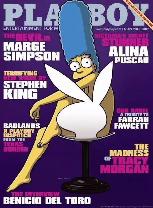 而且她还创下了《花花公子》第一次使用卡通人物做封面的历史记录,混得和Marilyn Monro、Cindy Crawford平起平坐,内页还有她大篇幅的访谈、资料、插图,儿子Bart在杂志发售的那几天都很适合穿一件T去学校,叫:我妈超正。