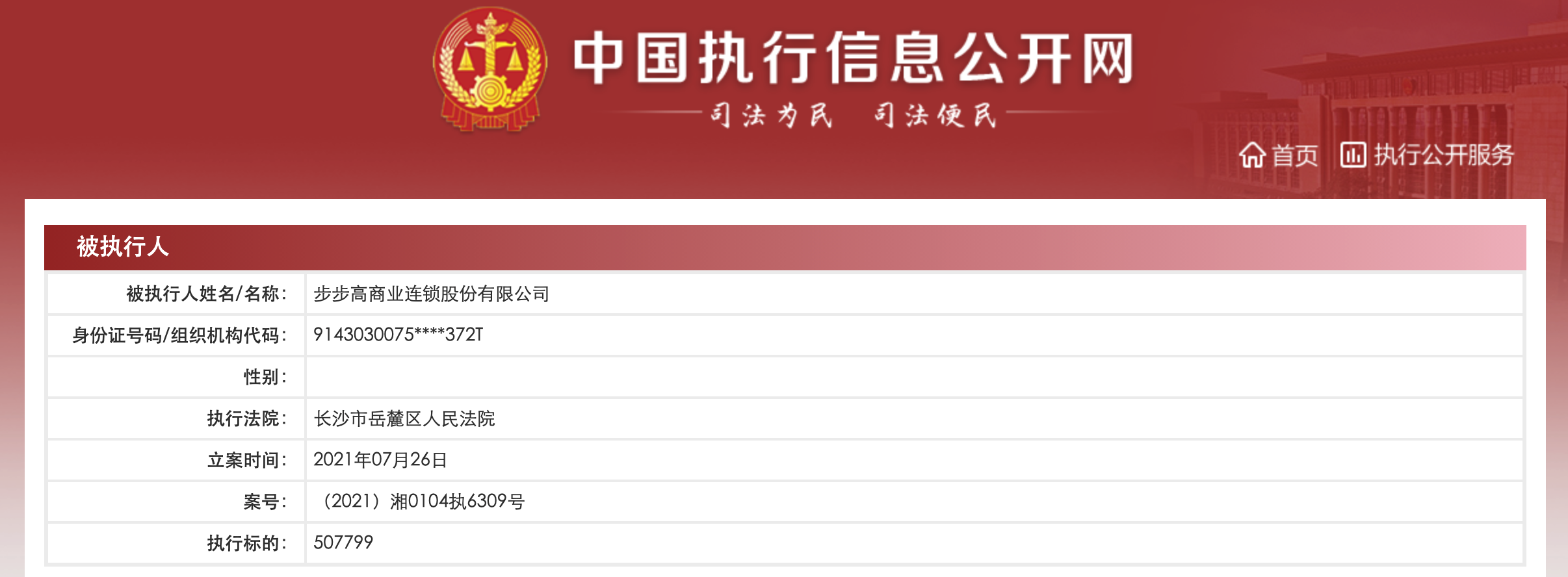 中国执行信息公开网显示,7月26日,步步高商业连锁股份有限公司新增被执行人信息,案号(2021)湘0104执6309号,执行标的507799元,执行法院为长沙市岳麓区人民法院。