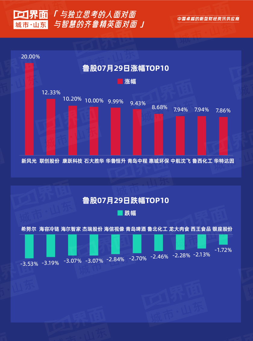 受大盘影响,7月29日,山东207只股上涨,37只股下跌,5只股持平。