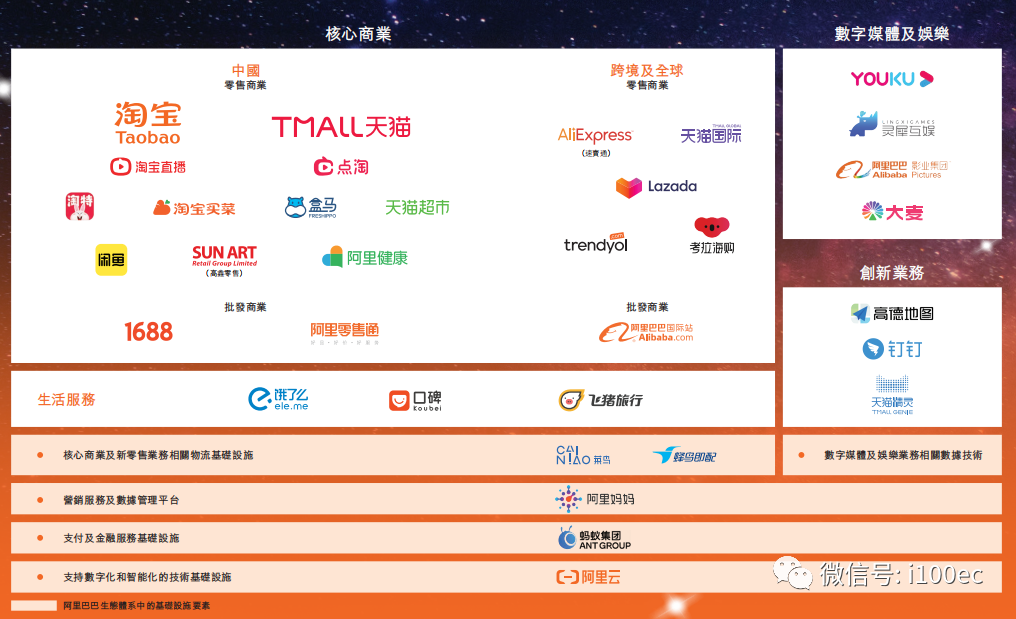 生态体系中,核心商业包括:淘宝、天猫、点淘、盒马、天猫超市、阿里健康、阿里零售通、1688、淘特、闲鱼、淘宝买菜、阿里国际站、全球速卖通、天猫国际、Lazada、考拉海购等。