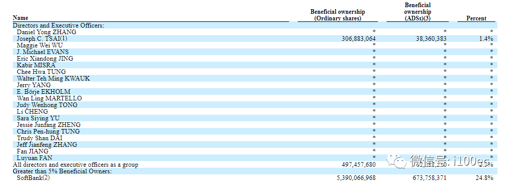 年报显示,软银持股5390066968股普通股,占股达24.8%,仍是阿里巴巴最大股东。而阿里巴巴所有董事和高管持有阿里巴巴497457680股普通股,占股2.3%,其中董事局副主席蔡崇信拥有阿里巴巴306883064股普通股,占股1.4%。而公司创办人马云持股锐减,已经不在主要股东名单上。根据阿里巴巴2019年报显示,马云持股4.8%。