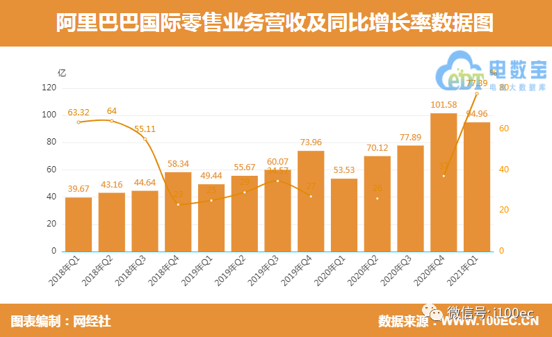2021财年,来自国际商业零售业务的营收为人民币344.55亿元(约合52.59亿美元),较2020财年的人民币243.23亿元增长42%。
