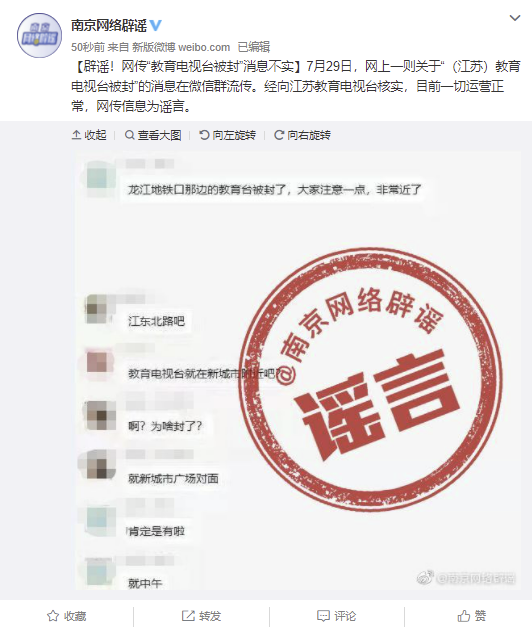@南京网络辟谣 微博消息,7月29日,网上一则关于“(江苏)教育电视台被封”的消息在微信群流传。经向江苏教育电视台核实,目前一切运营正常,网传信息为谣言。