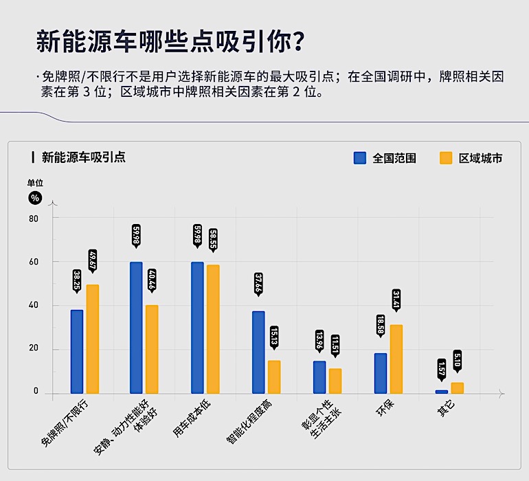 通过线上及线下方式对全国1625名受访对象进行采样分析,研究者发现,“用车成本低”是对新能源汽车消费者的最大吸引点。这一结果意味着,以往被认为是推动新能源汽车消费主要动机的路权问题,对消费者的实际影响低于预期。